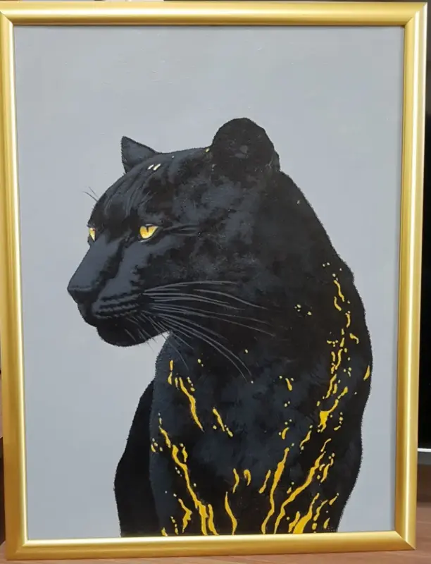 Картина акриловыми красками "Чёрная пантера" на ДВП 30 см Х 40 см по мотивам фотографии, опубликованной в свободном доступе в Интернете (в рамке). Художник Д.Пастин.
