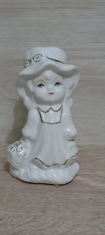 Старинная керамическая статуэтка маленькой девочки в шляпке и с корзинкой для хлеба в руках. Статуэтка белого цвета с золотой отделкой. Хорошее состояние, без сколов, трещин и сколов. Цена 35р.