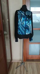 Женская блузка 44 размера. Можно и на 46 размер,но на небольшую грудь. Модель прямого силуэта с воротником стойкой. Застежка - планка на мини кнопках. Рукава длинные с манжетами. Блуза выполнена частично из черного шифона и цветного, ярко - синего натурального шёлка. Модель дизайнерская, шилась как экспериментальная, новая.