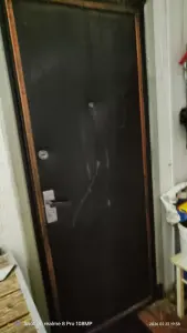 Металическая входная дверь. Тяжелая.Открывается наружу. Два замка, ключи есть 1999г. Проем: 90*210