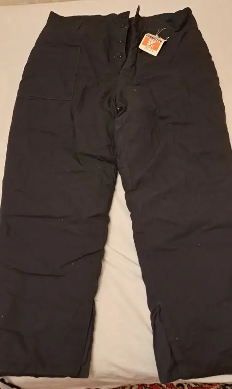 Брюки мужские как ватники, новые (спец.одежда, роба), р.48, черные, новые из СССР, 1986г, пригодятся для рыболовов и работы на стройке, фирма «Коминтерн», г.Речица, длина брюк по боковому шву (от пояса до низа)-103см, по внутреннему шву-69см, ширина в поясе-48*2=50см, в бедрах-60*2=120см, ширина брюк внизу-19.5см.