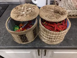 Контейнеры круглые с крышкой для хранения из джута ручной работы. Размеры - диаметр - 16-18см, высота - 13см. Цена - 15 рублей за штуку. Отправка Европочтой. (Александр)