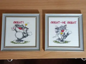 Картины вышиты крестиком, оформление в багетной мастерской. Размер по внешней стороне рамочки 22 х22 см. Цена за одну картину.