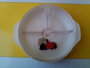 Пластиковая, с 3 отделениями, на резиновой ножке-присоске для устойчивости. Цвет прозрачный сверху, белый снизу. Подогрев пищи поддерживается при помощи горячей воды в специальном резервуаре. Диаметр 19см, высота 6см.