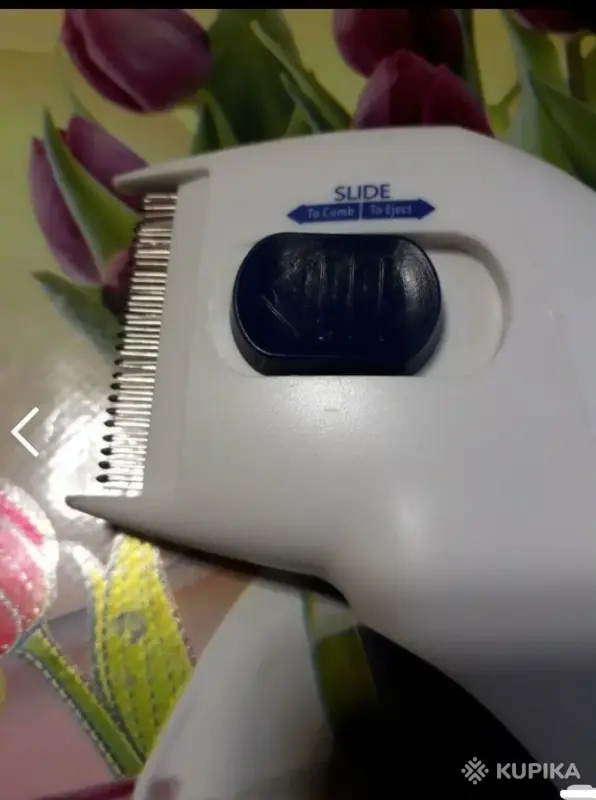 Принцип работы: очень частая расческа вычесывает шерсть, блоха попадается на зубчики и разряд тока её убивает,