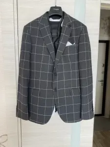 Красивый костюм двойка. На одну пуговицу, один разрез сзади, внутренние карманы с двух сторон. В хорошем состоянии. Целый.