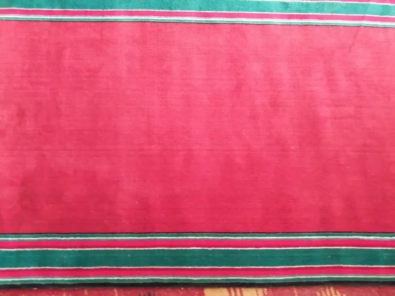 Искусственная, с ворсом. Цвет бордовый с зеленой окантовкой. Р-р: ширина 102см, длина 272см, размер окантовки 16см с каждого краю. Практически новая, т.к. пользовались только одну зиму.