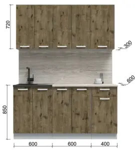 Длина по стенам: 3330 х 1500мм; нижний ряд (высота/глубина х ширина): 870/600 х 800 х 800 х 500(эл.плита) х 600 х 900 х 300(полка)мм; верх: 720/320 х 800 х 500(вытяжка) х 600 х 400(угловой) х 600 х 300(полка)мм.