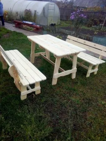 В наборе: две лавки со спинками длиной 1,2 м, ширина сидений 0,42 м и стол шириной 0,7 м и длиной 1,2 м. Из высушенных пиломатериалов хвойных пород. Без пропитки.