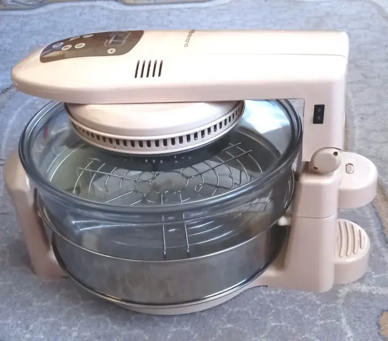 Функции: Удобное управление с настройкой температуры и времени, что делает приготовление простым и интуитивно понятным. В данной модели применен галогеновый нагревательный элемент, за счет этого пища готовится быстрей и не нагорает на нагревательный элемент. Скорость конвекции можно регулировать, благодаря чему можно добиться даже холодного копчения. Колба для приготовления изготовлена из жаростойкого, закаленного, ударостойкого стекла французской фирмы Akropil.