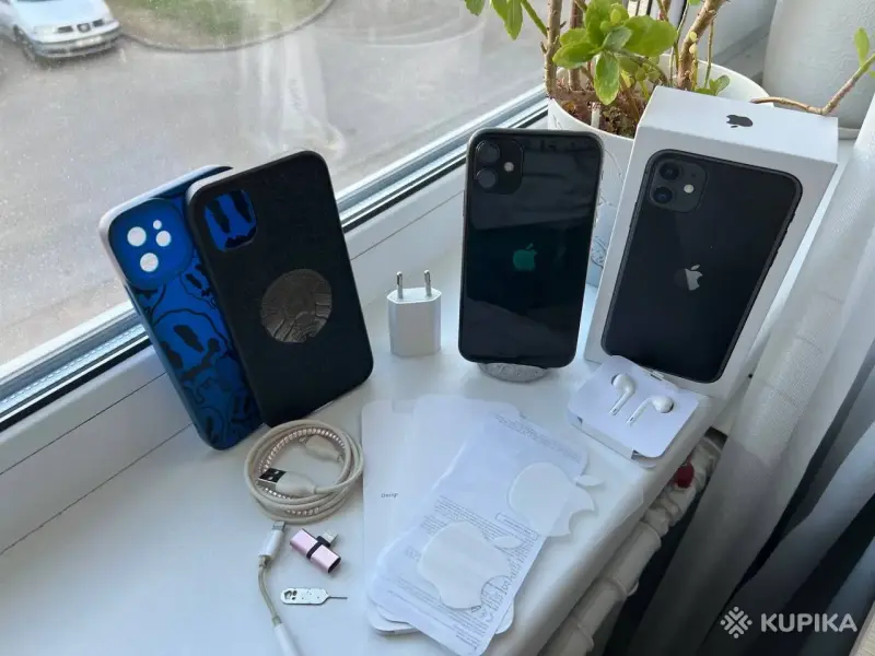 Iphone. 11 практически в идеальном состоянии. Из минусов только коцки по граням и акб 70 процентов. Богатый комплект, все рабочее и оригинальное. Фейс,трутон рабочие.