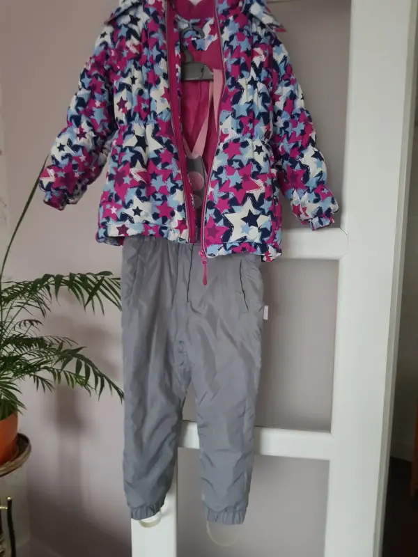 Зимний комплект (куртка+штанишки на подтяжках), рост 110 см. Куртка: плечи 33 см, рукав 41 см, длина куртки 50 см., капюшон отстегивается. Штанишки: длина 66 см, шаговая длина 43 см., на подтяжках, внизу фиксируются лямками. Почта, европочта