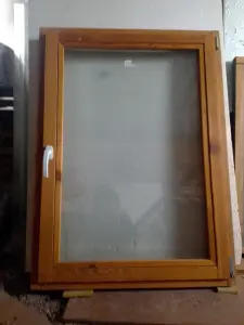 Окно поворотно-откидное разм.850х1100 мм. из сосны тройной стеклопакет. Двери распашные из дерева, стекло бронза матовое. 6 шт. из сосны, разм.200х60 см. окрашены в бежевый цвет. Наличник из дуба 20 шт. Все изготавливал сам, еще лет 15 назад.