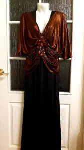 эксклюзивный дизайн. Основная часть платья выполнена из чёрной ткани на чёрном чехле. Украшает платье красивое несъёмное болеро кофейно-золотого цвета. Впереди болеро оформлено богатым поясом в форме цветка с лепестками, украшенными переливающимися камнями янтарного и гранатового вида, а также огненно сияющимися паетками. Платье имеет впереди и сзади глубокий треугольный вырез. Для удобства надевания и подчёркивания силуэта фигуры сзади на середине спинки есть потайная молния. Платье куплено для важного торжества за $300. Надевалось два раза. Прицениться к платьям INVITO можно на сайтах бренда Invitocollection и других сайтах известных торговых площадок. Цена 225 руб. Торг. Самовывоз или перешлю Белпочтой наложенным платежом, оплата пересылки за счёт покупателя.