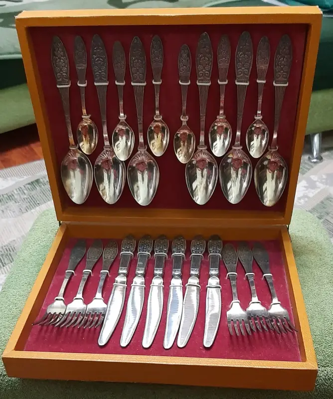 Набор столовых приборов "Ромашка" времён СССР состоит из 24 предметов на 6 персон. Каждый предмет набора имеет клеймо Рм в круге, свидетельствующее о его выпуске Режевским механическим заводом с 1973 г. до 1978 г. Изделия изготовлены из мельхиора, являющегося сплавом МНЦ (медь - 5-35 %, никель и цинк - 13-45 % ). Данная серия столовых приборов "РОМАШКА" имеет серебрение. Набор новый (НЕ ИСПОЛЬЗОВАЛСЯ): не полирован, родная патина, в оригинальном футляре "Ромашка". Для элегантных столовых приборов Режевского механического завода характерны: глубокое серебрение до 20 мкм; великолепный декор в виде цветов; изящная форма; качественный и очень прочный сплав. Набор столовых приборов "Ромашка" будет замечательным подарком на день рождения или на различные праздники, или станет украшением семейных застолий.