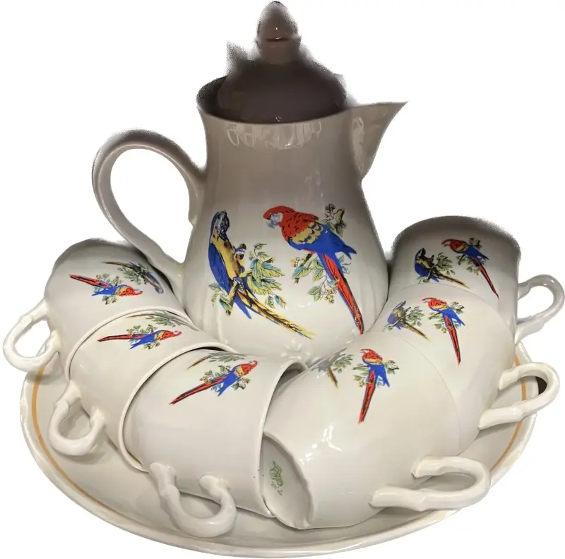 Сервиз. Кофейник + 6 чашек. Попугаи. Добруш. Фарфор. Клеймо (ставили на добрушском фарфоровом заводе с 1978 по 1991 года) СССР.