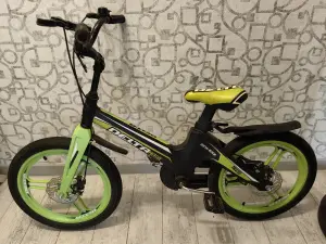Диаметр колес 16". Облегченная рама. Литые диски. Есть дополнительные колёсики и корзина. На раме есть незначительные царапины.