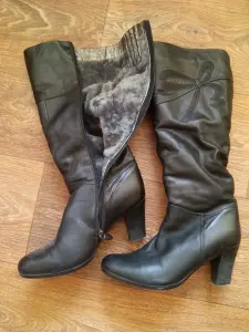 Сапоги зимние.Натуральная кожа.Натуральный мех(цыгейка).Цвет чёрный.Каблук 6см.Состояние:как новые.80 руб.