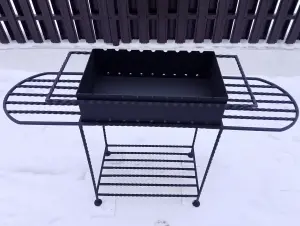 Размеры жаровни: 60х35х16.5 см. Толщина жаровни: 3 мм. Полная высота мангала: 90 см. Подставка: полнотелый квадрат 12х12 мм
