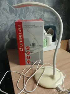Настольная лампа белого цвета,полностью рабочая.Стойка гибкая.Питание от USB. Высота 37 см, ширина 12.3 см.Имеется 3 уровня яркости.