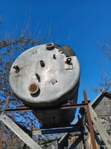 Алюминиевая бочка ( пищевой алюминий) цилиндрической формы. Размеры: длина - 2,0м; диаметр 1,3м. Толщина материала - 5 мм. В торцевых частях подводки для труб....