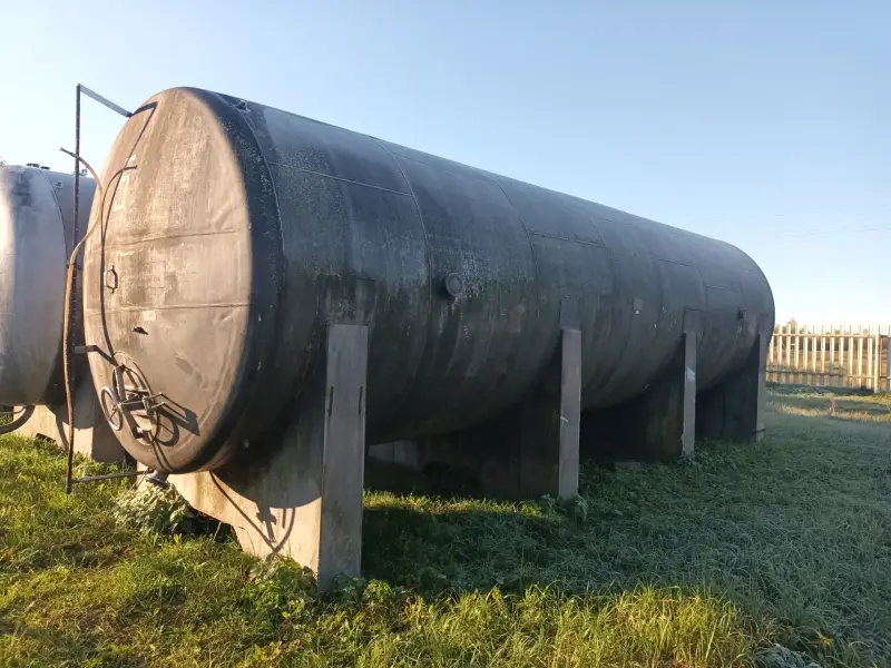 Емкость нержавеющая, горизонтальная. Емкость с ложементами. Длина 8.7 м. Диаметр 2.4 метра, высота с ложементами 3 метра. перевозится без проблем на полуприцепе.