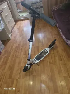 Самокат чёрный, большой. Для простого катания (не трюкового). Есть амортизаторы. Задний тормоз. Ручка выдвигается вверх на 3 яруса. Специально покрытие чтобы не скользила нога. Слаживается. В хорошем состояние!