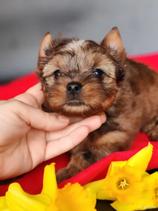 мальчик йоркширского терьера в редком окрасе Ocean Pearl merle , рождён 05.03.2026 ,предполагаемый вес 2.500кг,на коротких лапках с крепким костяком, очень красивый типаж, густая шерсть, перецветет в кремо-персиковый цвет, папа шоколад мама голубое мерле с голубым глазом