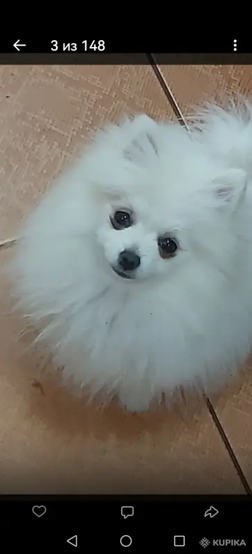 Замечательный малыш померанского шпица практически белого окраса(айс крем) .6 месяцев.Вес на данный момент 2кг. 100 грамм .Счас он в линьке(пырзик). Можно увидеть маму и папу.Привит по возрасту,обработан симпарикой, заведен ветеринарный паспорт.Очень ласковый и игривый, контактный.Приучен к пелёнке ,гуляет с удовольствием на улице.Безумно контактный дружит с котом и другими животными.