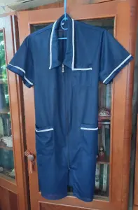4-халат женский рабочий: материал – типа плащевки, темно синий, размер 48-52, ширина плеч сзади 51 см, длина рукава 63,5 см, длина по спинке 109 см, спереди пуговицы, манжеты с пуговицами, б/у в хорошем состоянии.
