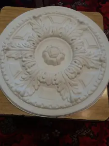 Из полистирола, диаметр 33см, цвет белый, можно под покраску. Крепится на клей.