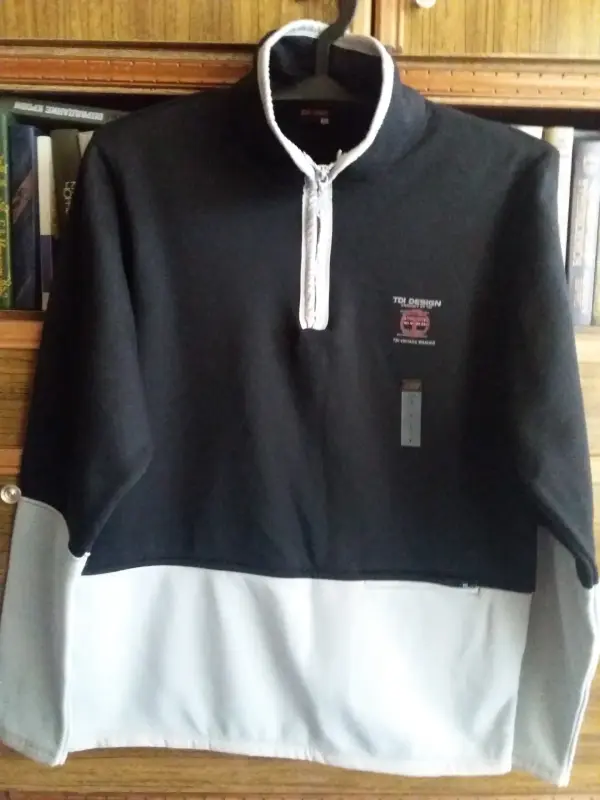 Байка мужская с длинным рукавом, размер 50-52 (L ). Состав: 65% хлопок, 35% полиэстер. Цвет черный с серым, ворот высокий на молнии, с левой стороны между черным и серым цветом имеется карман на молнии, на груди и левом рукаве эмблемы, рукава и низ прямые, внутри утеплена. Ширина в груди 56 см, плечо 16 см, рукав 70 см, длина 76 см.