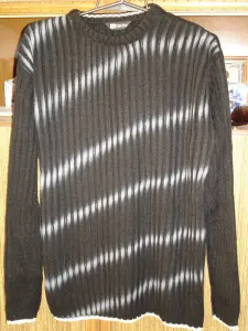 Свитер мужской с продольным узором вязки; состав 30% шерсть, 70% акрил. Цвет черный с поперечной белой полосой на груди и рукавах. Размер (L) 48/50, низ свитера и рукава прямые. Ширина в груди 56см, длина 72см, ширина плеча 17см, длина рукава 60см, высота горловины 7.5см, боковые разрезы 8см, ( все измерения без растяжения свитера).