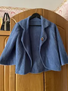 Кофта на пуговицах черного цвета, по низу и обшлагам рукавов украшена гипюром, на размер 40 - 42. ПОГ - 32 см, ПОТ - 28 см, длина - 53 см. Хорошо тянется.