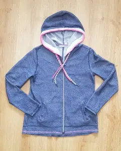 Толстовка выполнена из структурированного материала в сине-сером меланжевом цвете с яркими розовыми акцентами на шнурках, молнии и капюшоне.