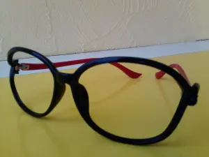 Пластмассовая, цвет черный, дужки красные. Высота оправы 51мм, носовое расстояние 12мм, ширина линзы 57мм, полная ширина 139мм, длина дужки 134мм.