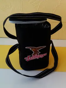 В форме бочонка с двумя ручками и двумя замками на молнии. Цвет черный. Размеры: высота 23см, длина 15см, ширина 15см, объем 5л.