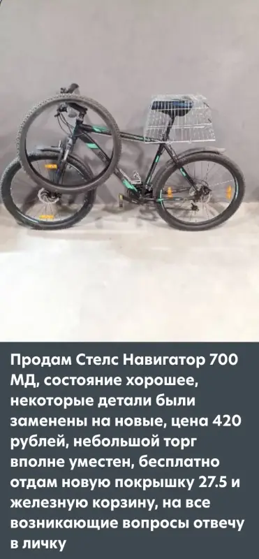 Продам велосипед стелс 700 навигатор мд, состояние хорошее, все рабочее, прекрасно переключается, по работе нареканий нету, заменены шифтеры 3 и 7 скоростей, задняя трещетка, грипсы, тросики, и новая накладка на седло, цена 420 рублей, небольшой торг вполне уместен, бесплатно отдам новую покрышку 27.5 и железную корзину, все возникающие вопросы по телефону +375 333821495