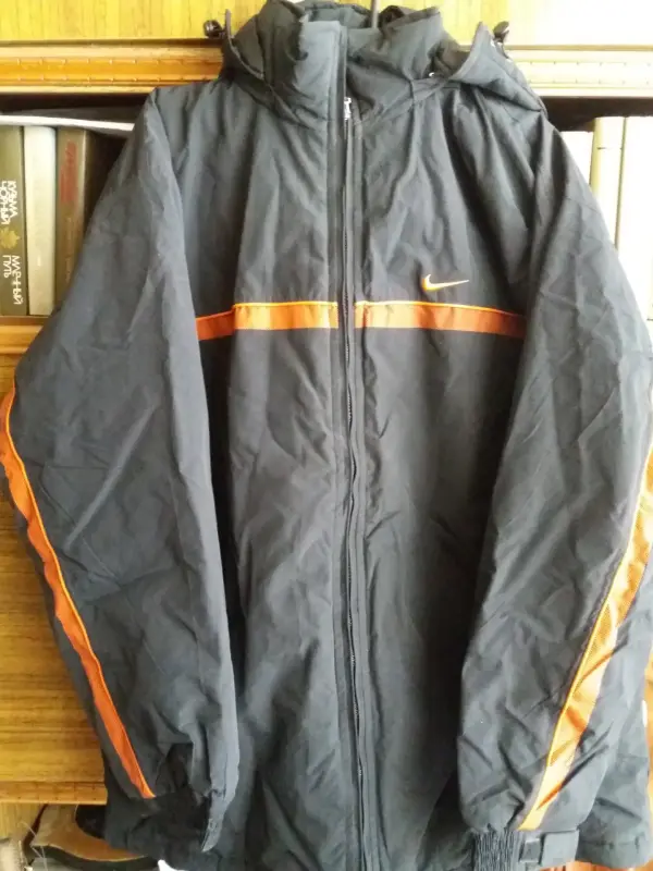 Демисезонная, с отстегивающимся капюшоном, на молнии, цвет черный с отделочными оранжевыми полосами на груди, спине и рукавах. Размер 64 (XXXXL). Имеются 2 кармана (внутри застегиваются на молнию), рукав на манжете (регулируется липучкой), низ прямой (тоже регулируется по ширине). Внутренняя часть простегана и имеет 2 кармана ( на липучке и для мобилы). Размеры: полуобхват в груди 68см, полуобхват в бедрах 66см, длина 84см, длина рукава с манжетом 66см, плечо 21см.