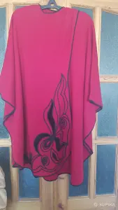 Пончо (оверсайз), шерстяная ткань малинового цвета с отделкой из черного цвета. Второе фото это спина, размер 48-54. Вышлю почтой или европочтой