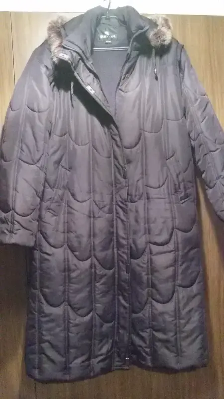 Пальто демисезонное на синтепоне с капюшоном (с мехом искусств.), на двухстороннем замке и кнопках, б/у, как новое, р.52-54, капюшон отстёгивается (на замочке). Цвет красивый, баклажан.