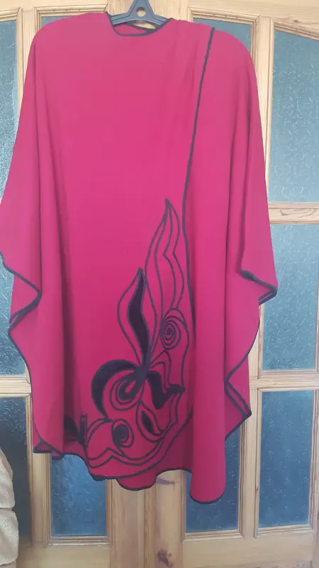 Пончо (оверсайз), шерстяная ткань малинового цвета с отделкой из черного цвета. Второе фото это спина, размер 48-54. Вышлю почтой или европочтой