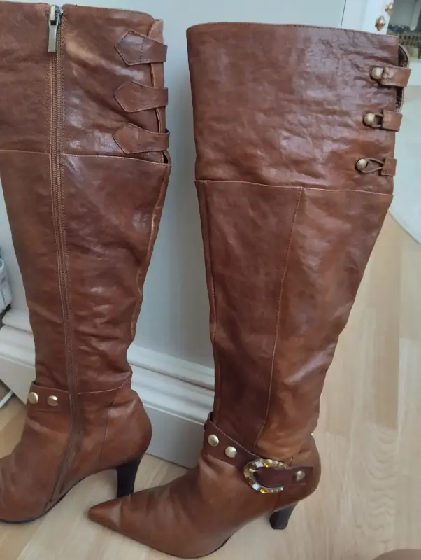Сапоги весна-осень, из натуральной кожи, высокие (до колена), молния по всему голенищу, удобная колодка, каблук 9см, вверху по голени 32см, немного б/у. Состояние отличное