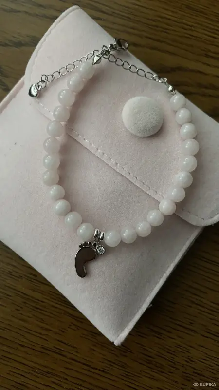 Браслет ручной работы. Из натурального розового кварца с подвеской. Подвеска в виде ножки. Можно подарить на рождение ребенка. Застежка с удлинением +5см. Подарочная упаковка с открыткой.