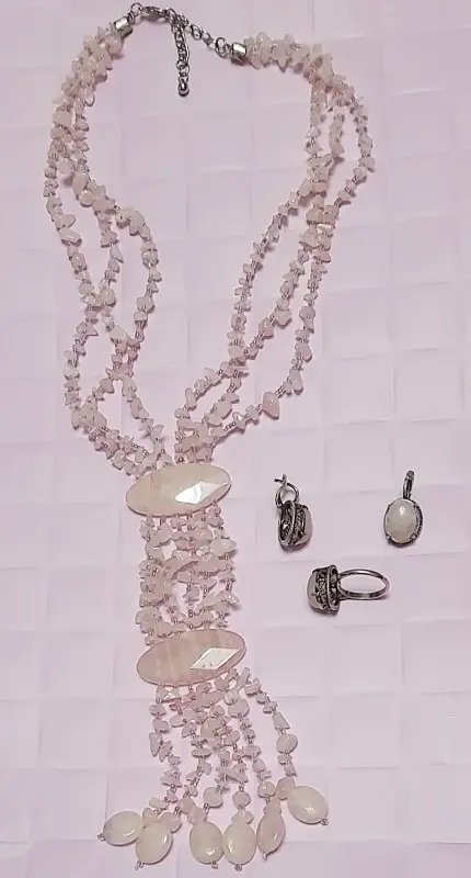 КОМПЛЕКТ УКРАШЕНИЙ "РОЗОВЫЙ ФЛАМИНГО" изготовлен российскими ювелирами из розового горного хрусталя друза. Оригинальный и очень красивый комплект "Розовый фламинго" содержит колье, кольцо и серёжки. Колье состоит из нитей с нанизанными на них маленькими и более крупными натуральными камнями и подвески, содержащей нити с камешками и большие овальные обработанные плоские камни. Колье застёгивается на карабинчик из ювелирного металла и имеет звено из цепочки, состоящей из колечек, что позволяет увеличить или уменьшить длину изделия вокруг шеи. Кольцо и серёжки изыскано обрамлены ювелирным металлом. Дизайн комплекта сразу же покорит Вас и бросится в глаза окружающим. Нежность "Розового фламинго" из необычнго розового горного хрусталя наполняет его невероятной романтикой, прелестью и удивительной красотой. Такой комплект могут позволить себе надеть не только юные девушки, но и вполне взрослые женщины. Однако каждую его обладательницу это украшение сделает еще интереснее и моложе, чем прежде, т.к. розовый - это цвет юности, весны, свежести и чистоты. Цена снижена до 155 руб. Торг. Самовывоз или перешлю Белпочтой наложенным платежом, оплата пересылки за счёт покупателя.